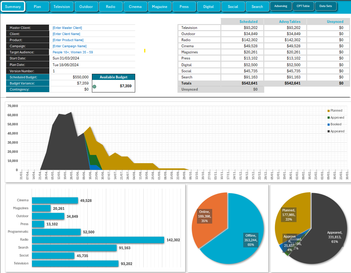 Mediums, Markets, Network, Media Owners, Audiences, Media Types and Sub-Types, Languages, Phases, Fee Types and Currencies are all downloaded from Advvy and utilised within the template. Dynamic.